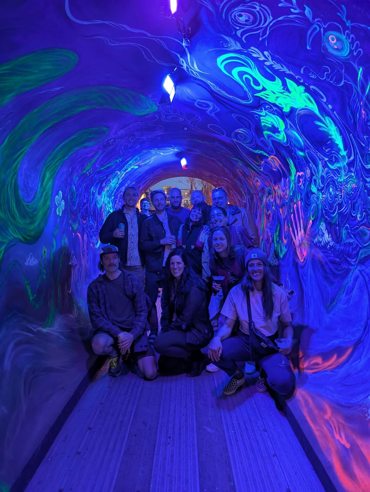 The use of ultraviolet light, fluorescent paints, and glow-in-the dark pigments allows this tunnel come to life in unimaginable ways.
